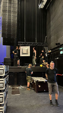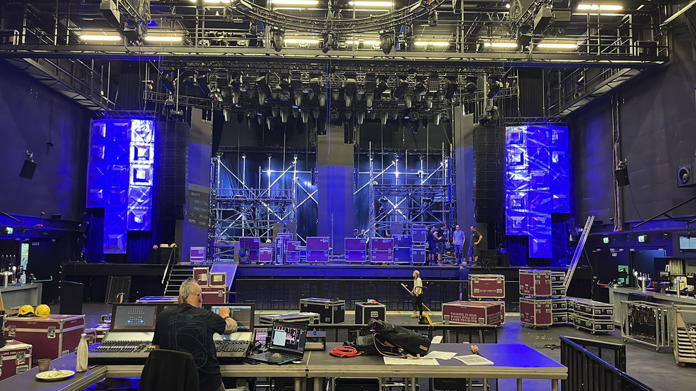 The buildup of the stage took over 4 days. Scaffolding company was working simultaneously with LED company rushing up to have stage ready for dress rehearsals. One of the interesting facts is that huge LED towers were in fact suspended from the ceiling and not standing on the ground as it might seem. This way we saved a lot of space - smart isn´t it? After that the implementation of lighting on the stage on the backdrop, on the scaffolding railings, audio, lasers, CO2 machines and pyros took place.